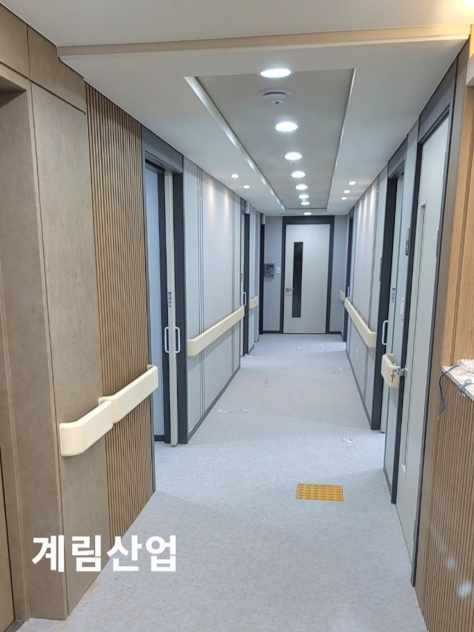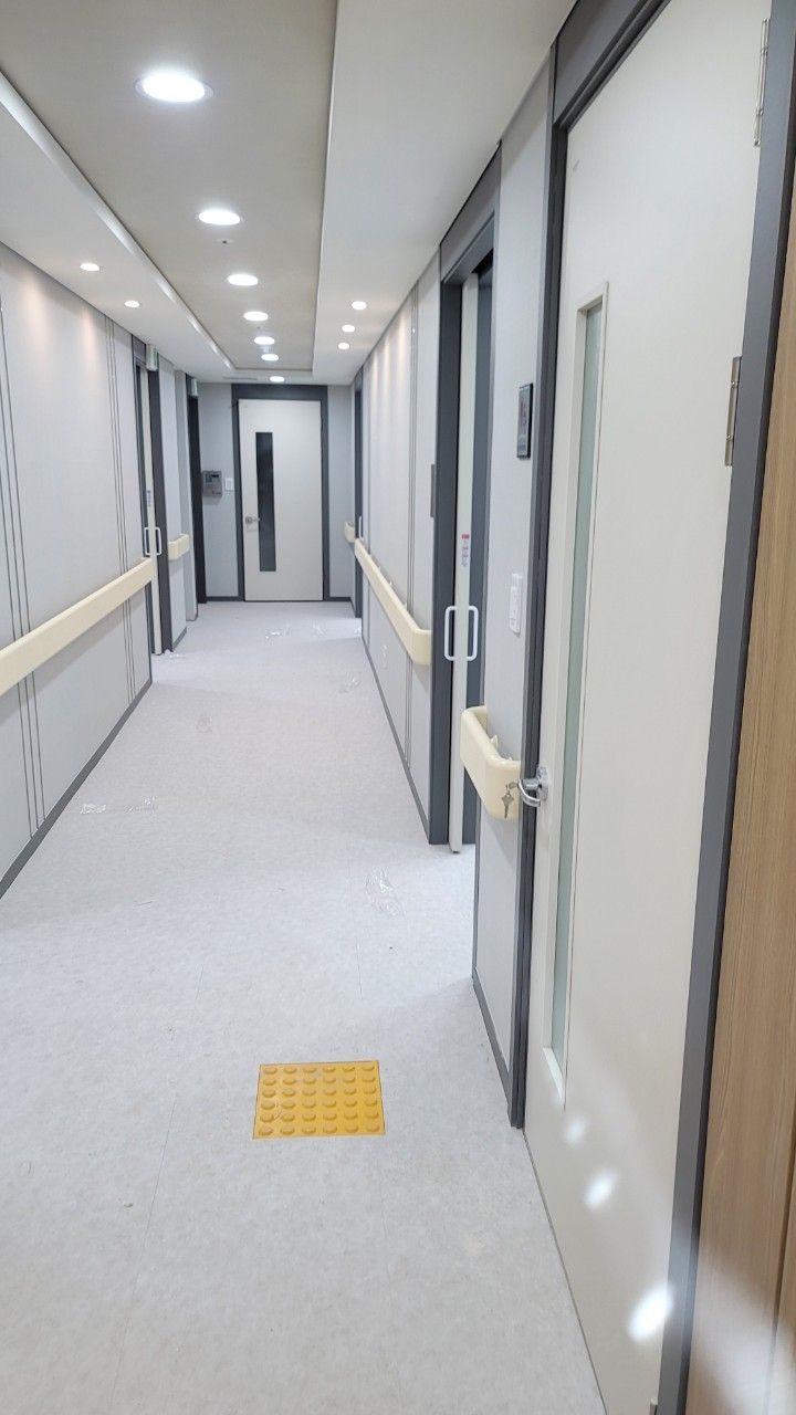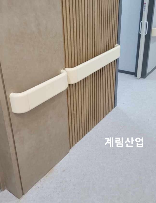 벽체 인테리어가 잘 되어있는 현장 입니다. 그러나 복도가 많이 넓지는 않아 침대나 카트, 휠체어 등 이 이동 할 경우 벽면을 상하게 할 수 있기 때문에, 이럴 경우에는 하부에 범퍼가드 GLW-150을 추가로 설치 하여야 이동 물체로 부터 벽면에 상처가 나는 것 을 보호 할 수 있습니다.