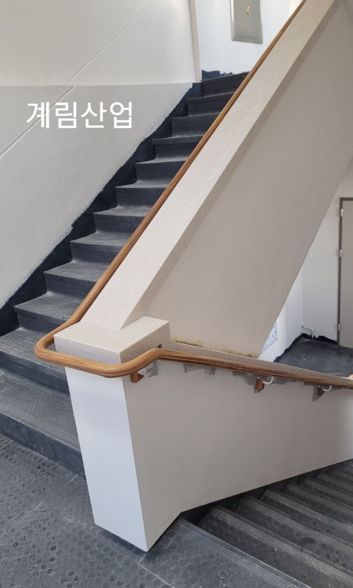 계림산업 www.gyelimic.com 서울 oo대학교 학생복지관건물 리모델링 공사중 장애인핸드레일 설치 공사. 벽부형핸드레일 GL-38. 건물이 계단 안쪽벽체도 콘크리트 구조로 되어 있습니다. 장애인편의시설 법규에 따라 핸드레일의 높이를 맞춰 시공하였습니다. 계단참 부분은 핸드레일이 끈김이 없이 시공을 하여야 하며 PVC핸드레일의 내부 심재인 알루미늄을 밴딩하여 설치하고 마지막에 PVC커버를 조립하여 마감합니다. 벽부형핸드레일 GL-38 은 공공시설, 학교, 병원, 노인요양시설, 장애우시설 등 대부분의 건축물의 계단이나 복도 등 에 설치하여야 합니다. 장애인 또는 환우, 노인, 어린이 등 사회적 약자들을 위해 꼭 필요한 시설물 입니다. 장애인용 벽부핸드레일 GL-38은 우드색 외 백색(아이보리색)도 많..